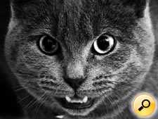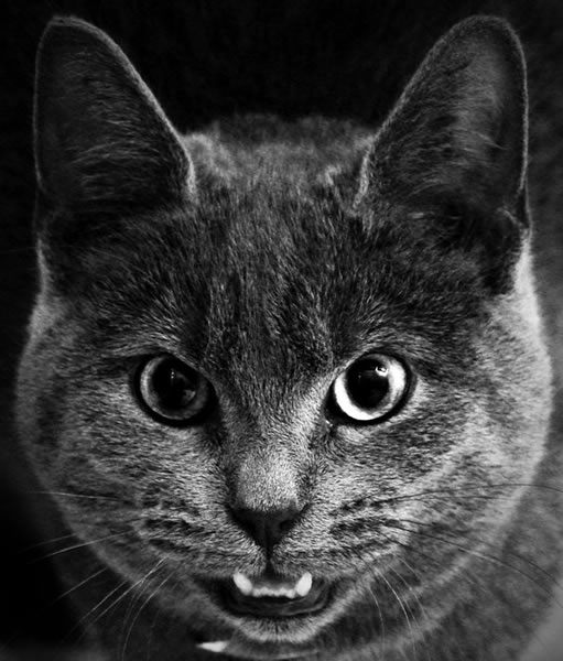 Kontext: Oči přímo upřené na protivníka, naježené chlupy, výhružně vysunutá spodní čelist.