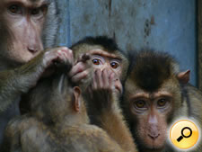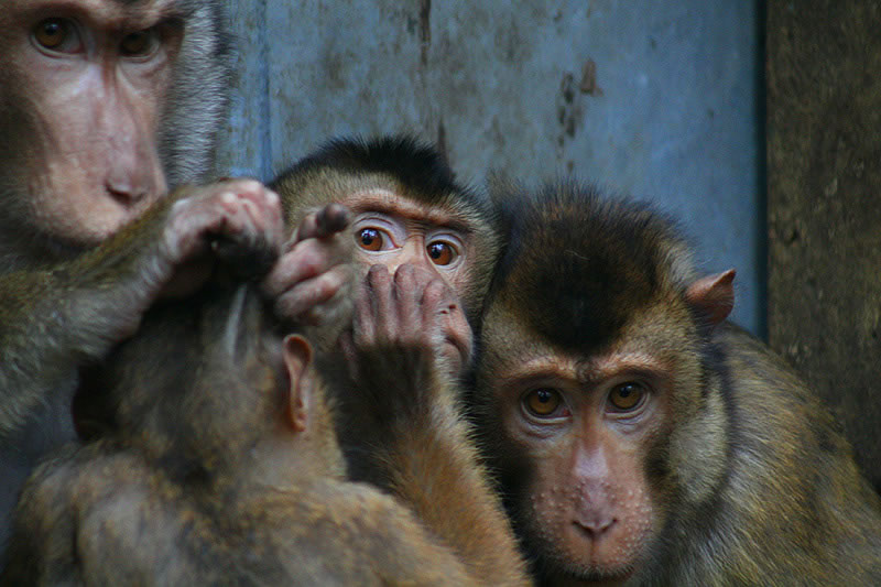 Kontext: Jedna opice se dotýká druhé, což znamená, že jsou si velmi blízké – náleží k jedné tlupě. Způsob postavení jejich těl a stejný, jakoby nejistý či ustrašený pohled okamžiku prozrazuje, že se před člověkem, který je fotografuje, mají na pozoru.