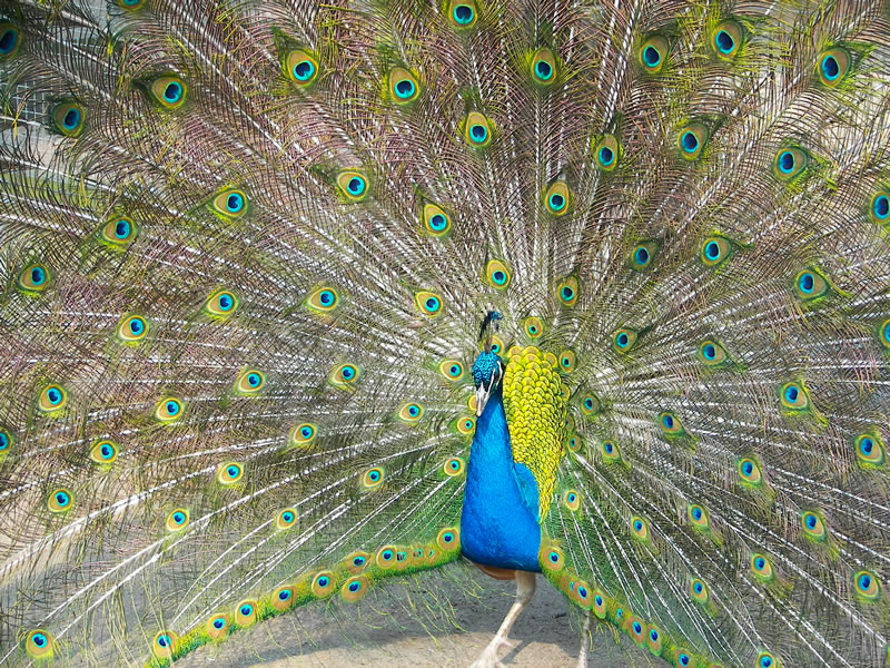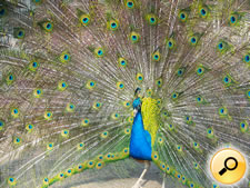 Kontext: Pevný postoj (váha je na obou nohou), vějíř z ocasních per je maximálně roztažen, krk vzpřímený, oči upřené na fotografa.